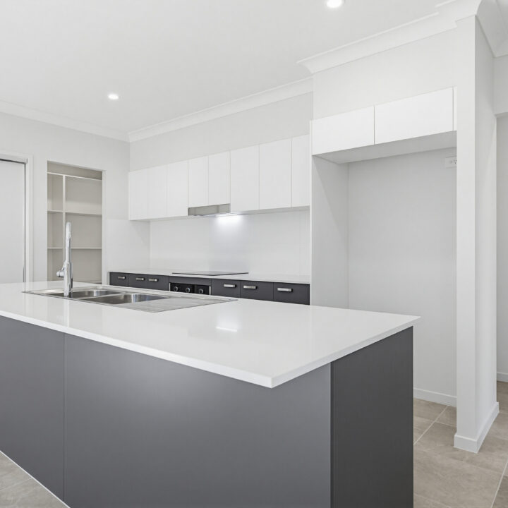 * Contemporary central kitchen with stone benchtops, integrated dishwasher, soft-close cabinetry, and quality electric appliances