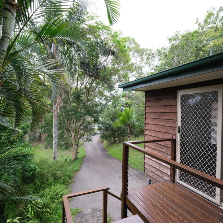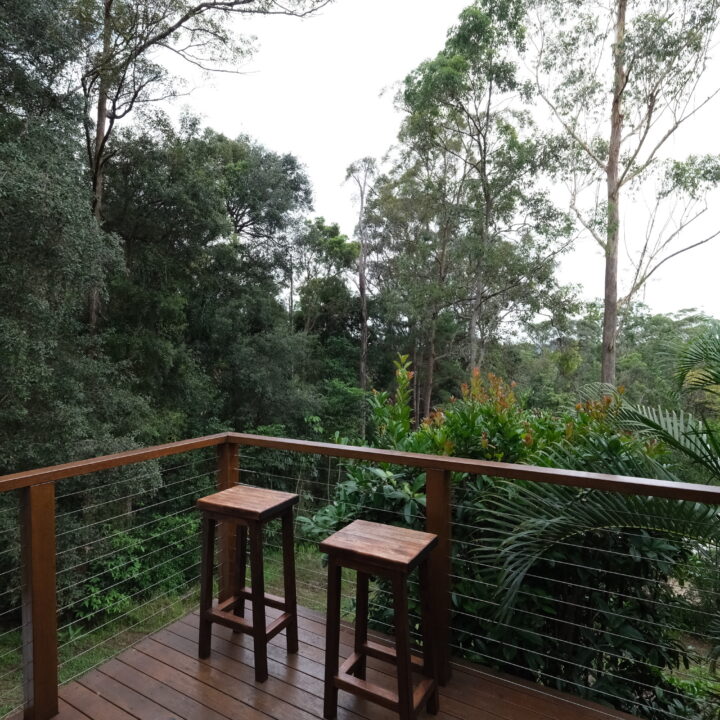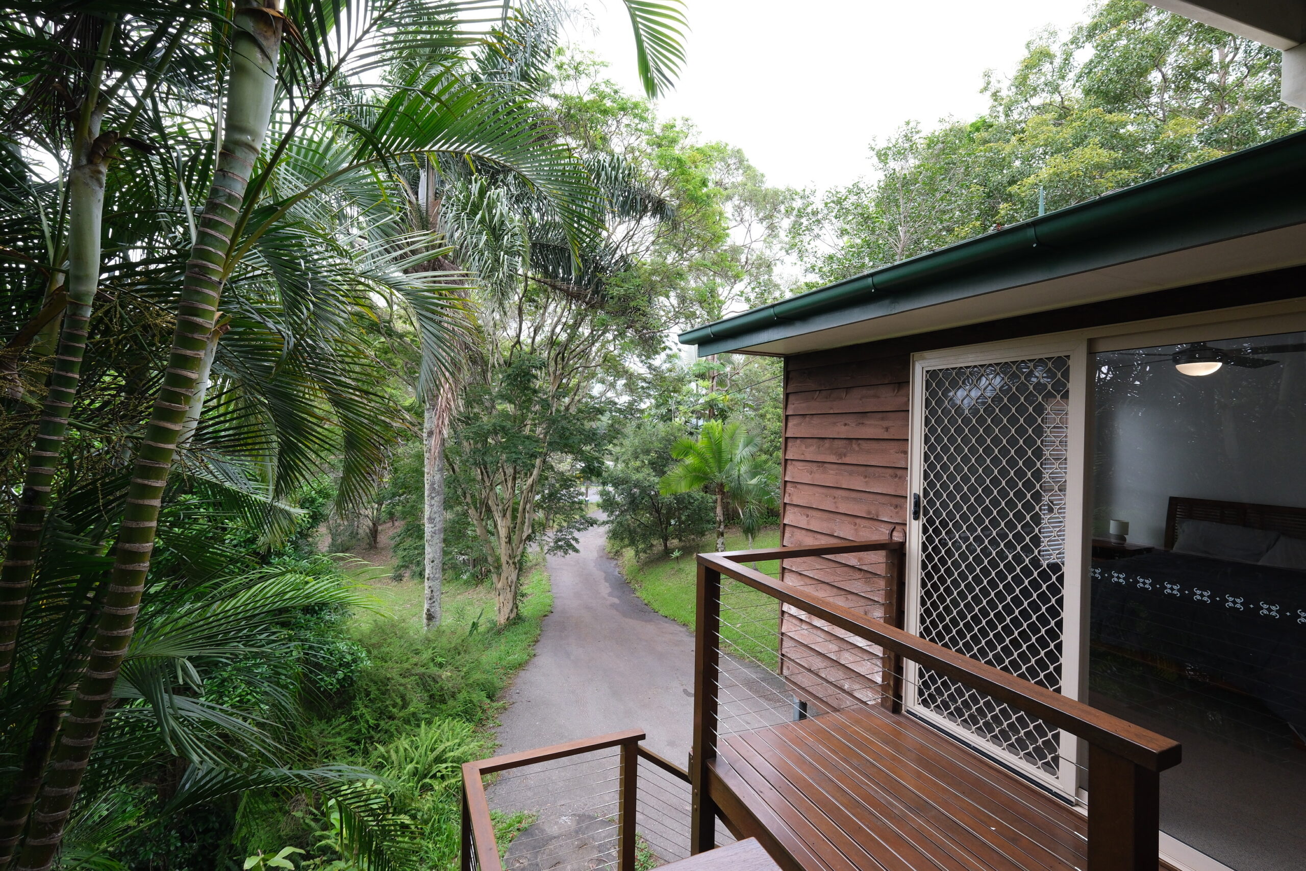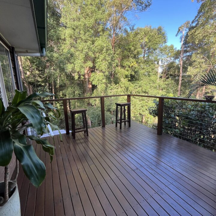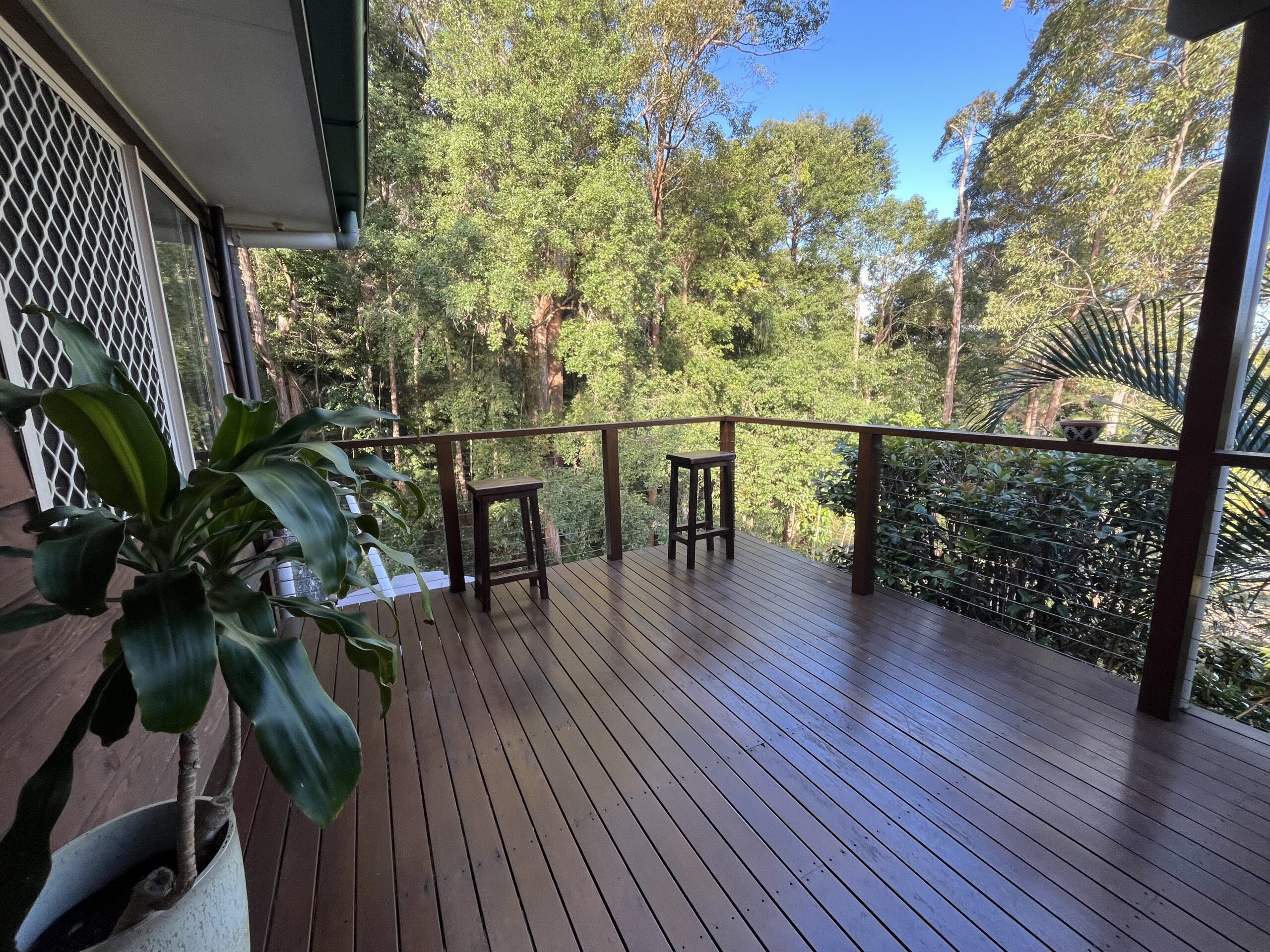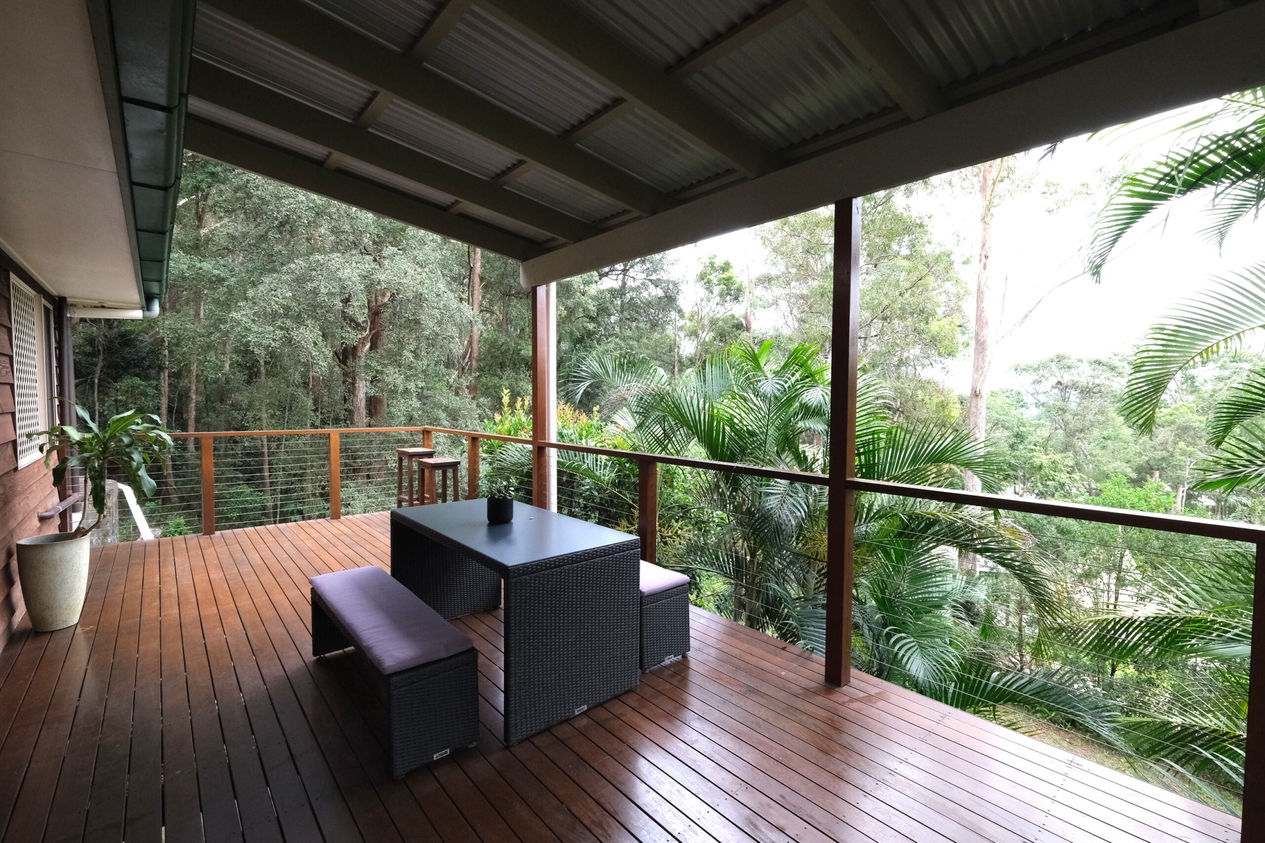 * A lovely wide deck across the front of the home, half covered and half open, overlooking your yard and into tranquil bushland