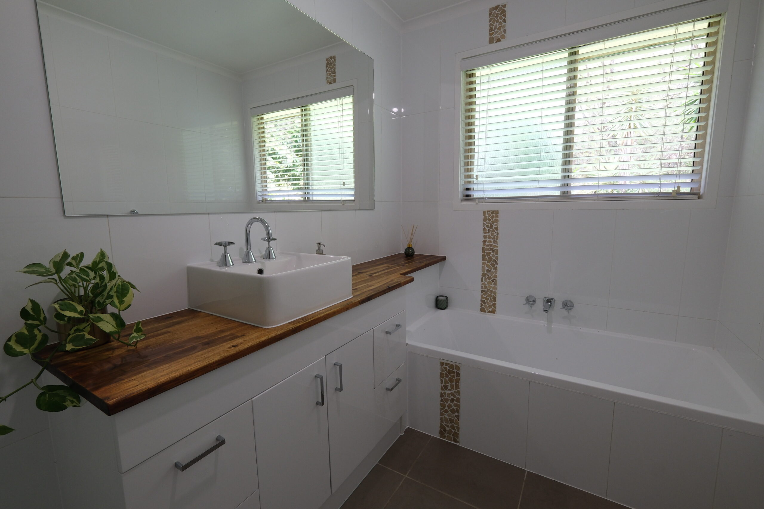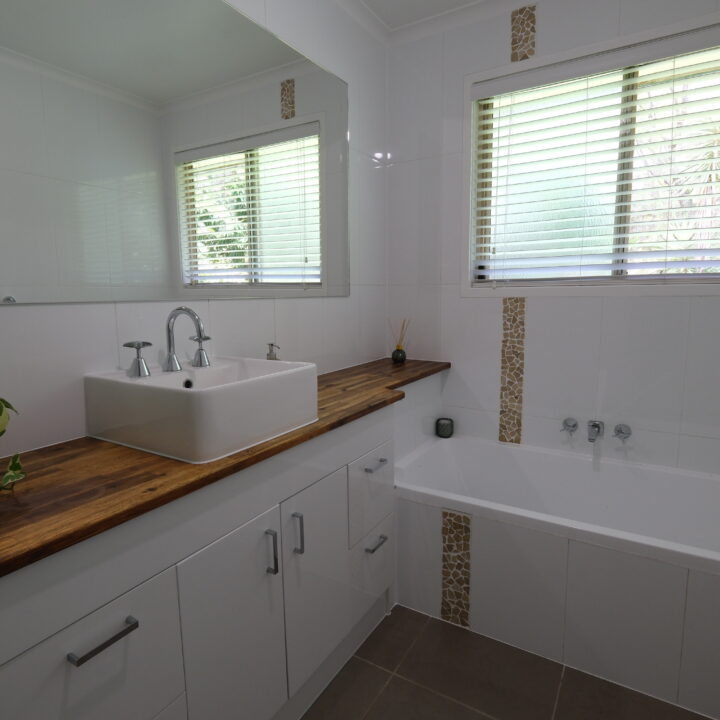 * Renovated family bathroom, with timber vanity top, floor to ceiling wall tiles, and a bath tub