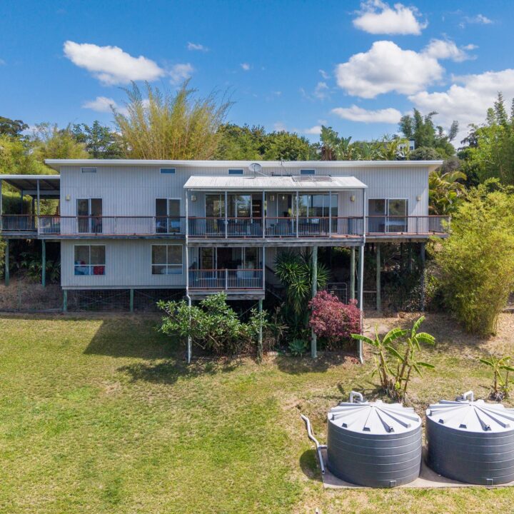Beyond the home, the lush surroundings include banana plants, native gardens, and a thriving koala sanctuary, offering both privacy and connection to nature within a close-knit, welcoming community. Practical inclusions such as solar hot water, two 25,000 L water tanks, and a carport with direct level access ensure comfort and sustainability.