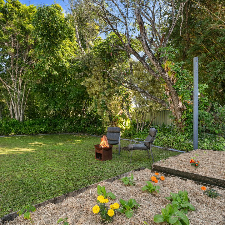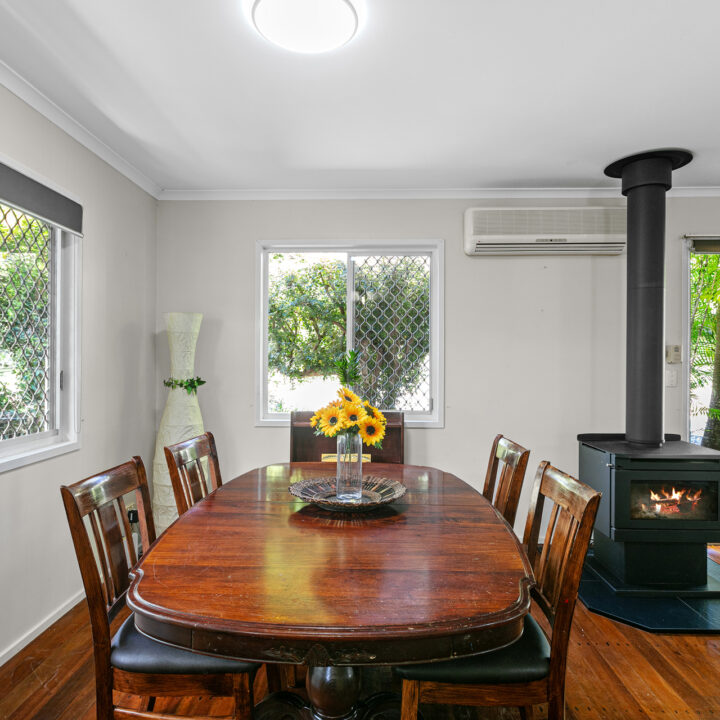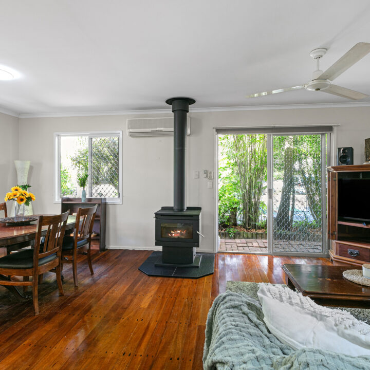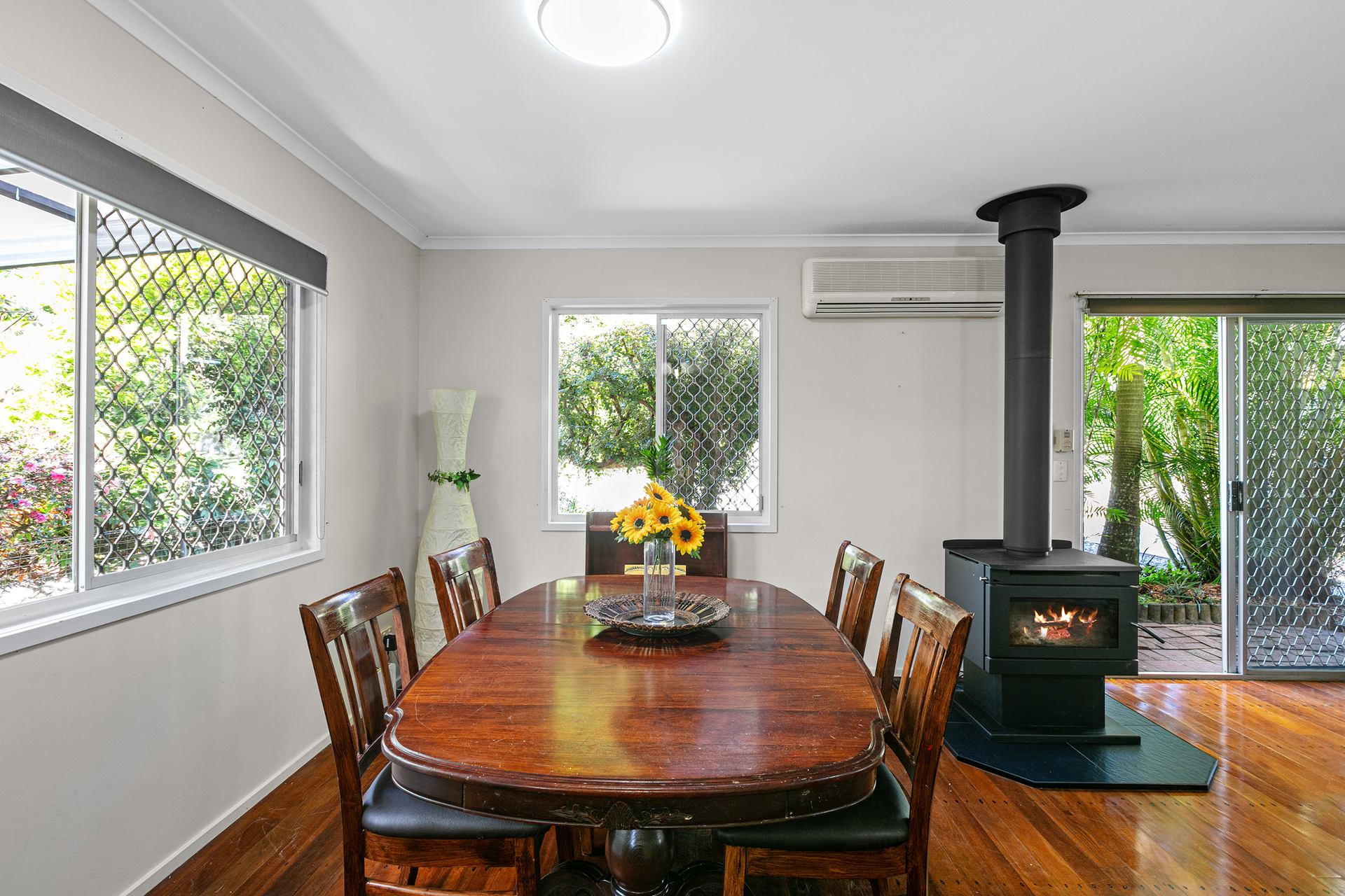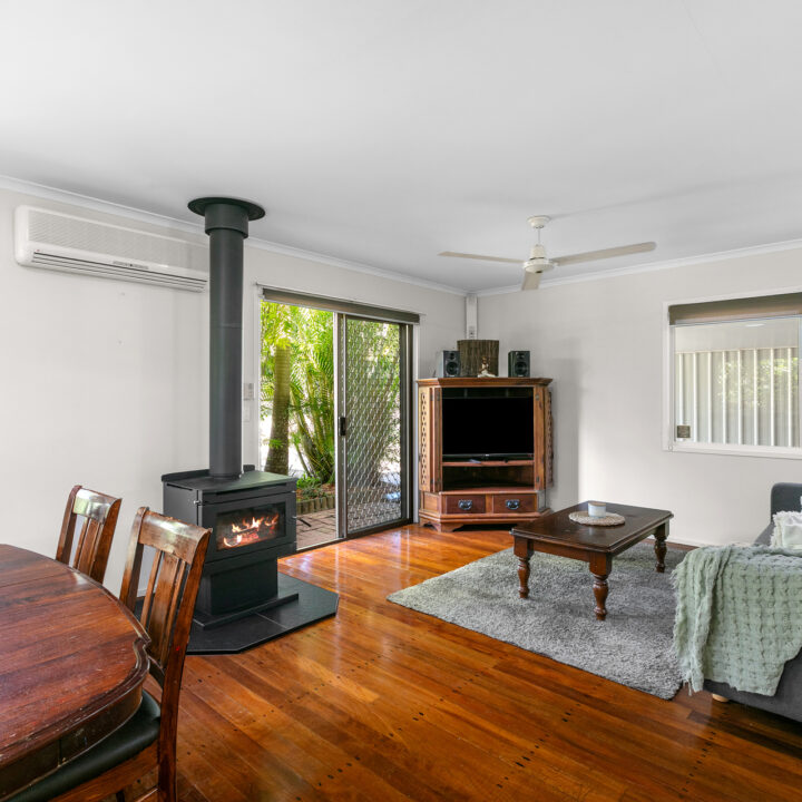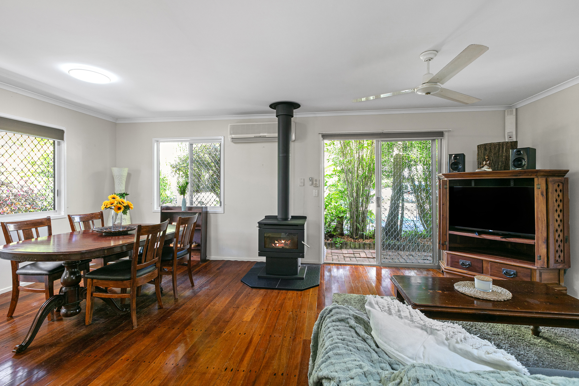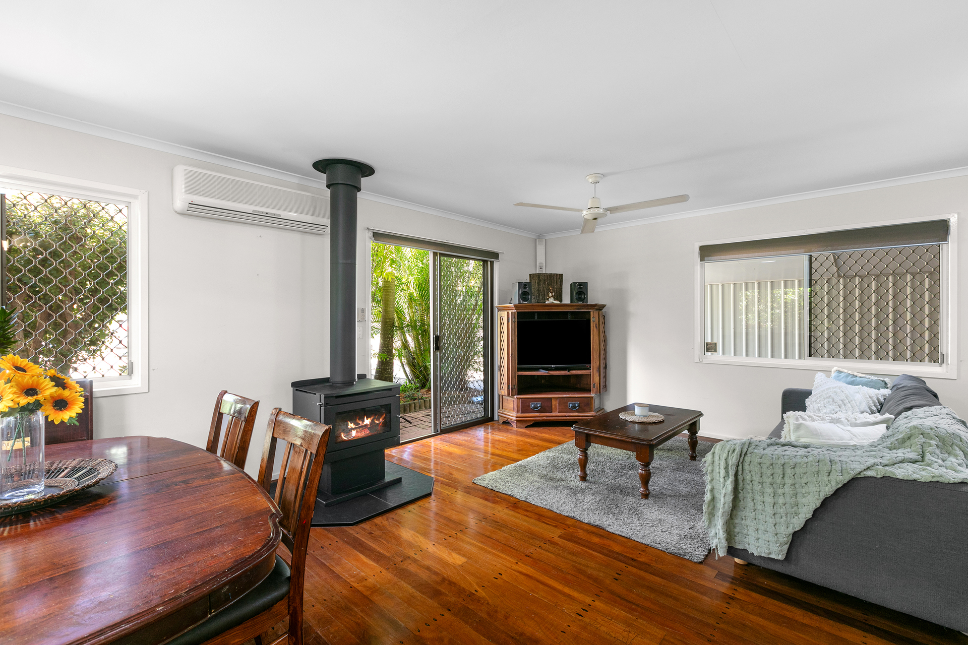 Inside, the home offers a warm and inviting vibe with open plan living and dining, featuring beautiful hardwood timber floors and a cosy fireplace to gather around in the cooler months. The galley-style kitchen enjoys morning sun and a lush garden outlook, complete with passionfruit vines and abundant birdlife.