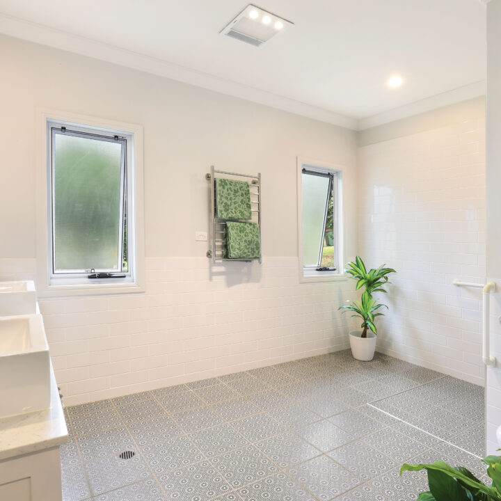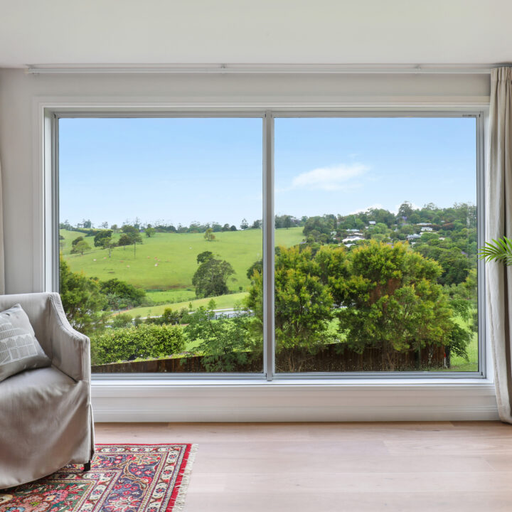 At the heart of the home, a spacious open-plan living and dining zone flows seamlessly to the gourmet kitchen – complete with custom cabinetry, stone benchtops and butler’s pantry. An enclosed, light-filled entertaining area with full-height windows captures sweeping views across the rolling hills, connecting both wings of this clever dual living layout.
