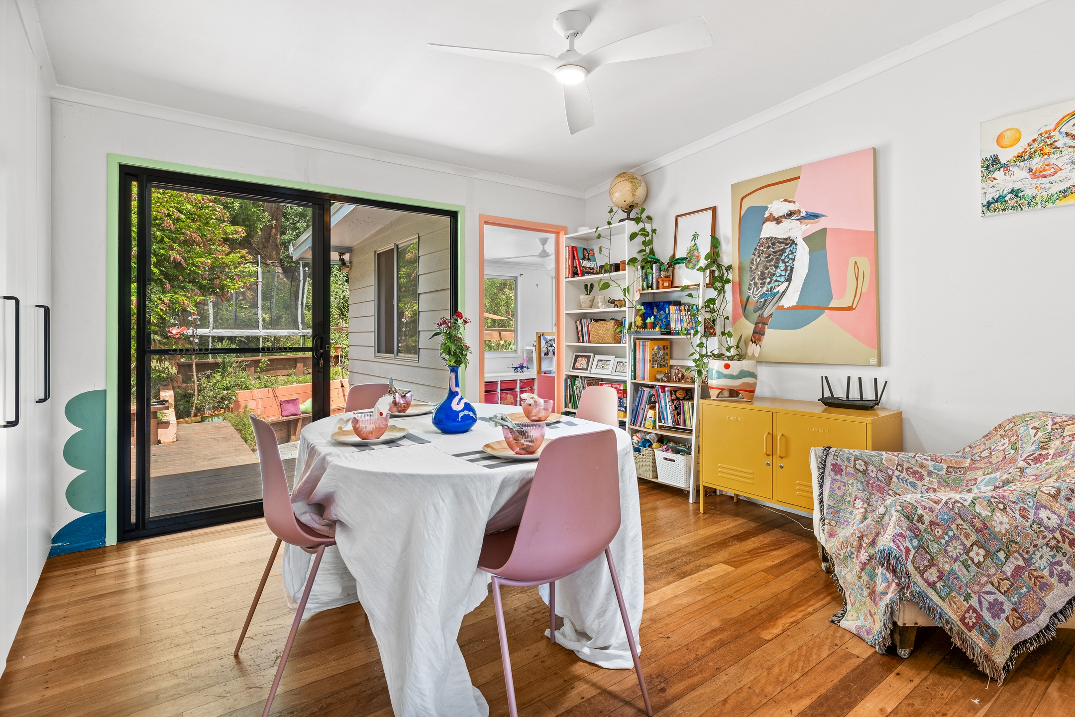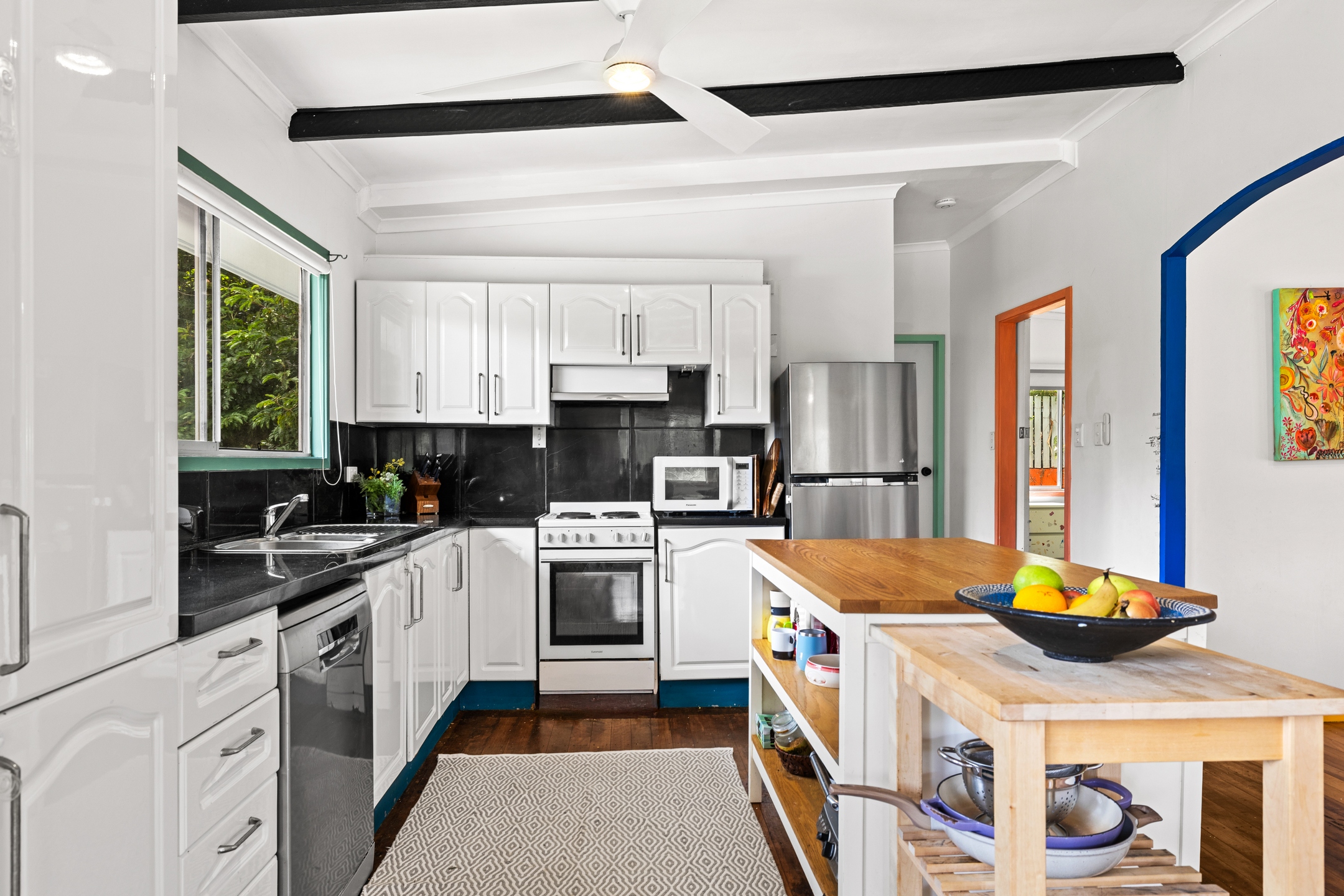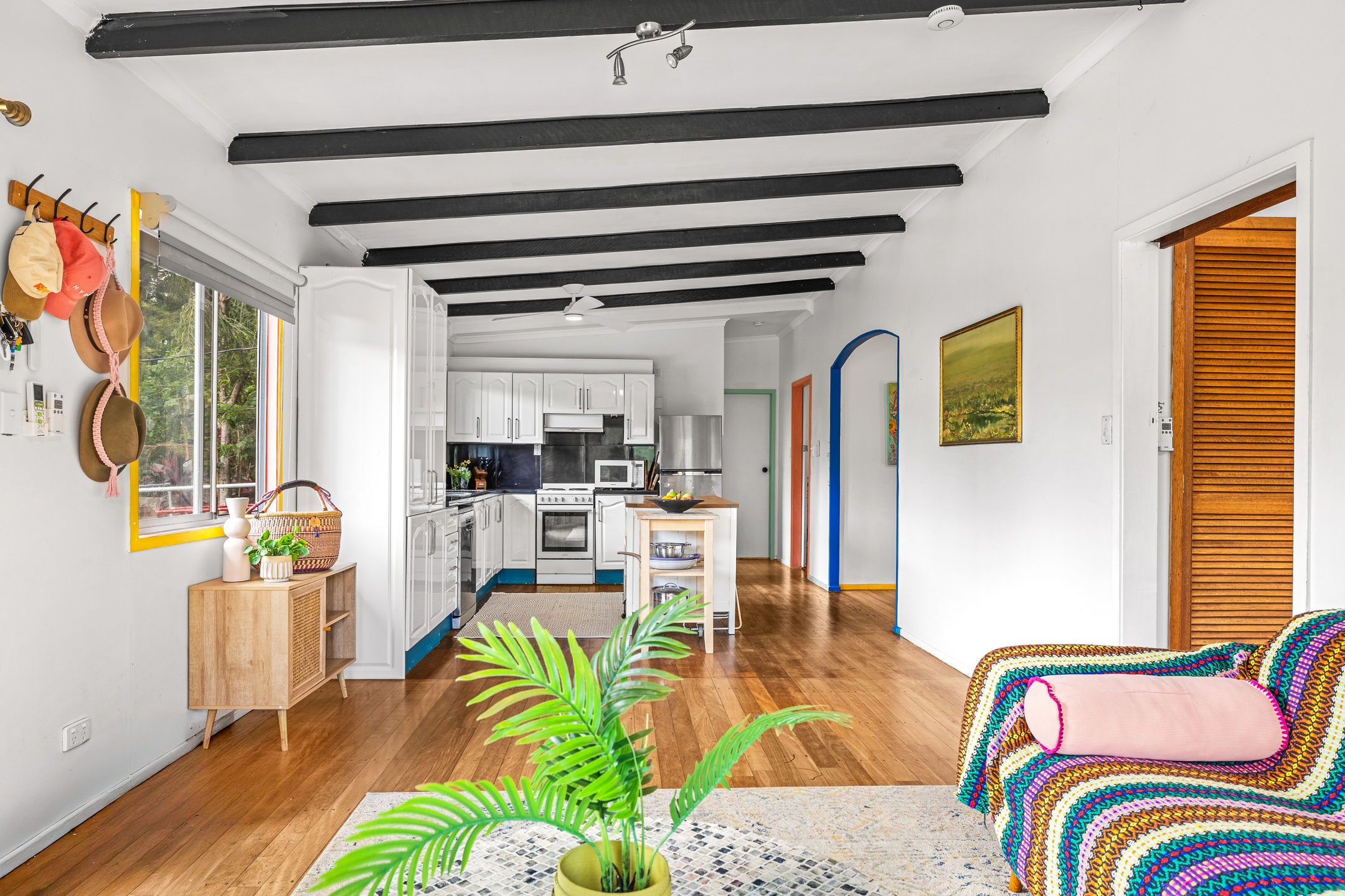 The layout is practical and comfortable, featuring three generous bedrooms, one bathroom, and an open-plan kitchen, dining, and living area that flows to the outdoors. Timber floorboards, high ceilings, cooling breezes, and natural light help keep the home feeling warm and welcoming. There is also a built-in office or work-from-home space under the house, creating flexibility for modern living.