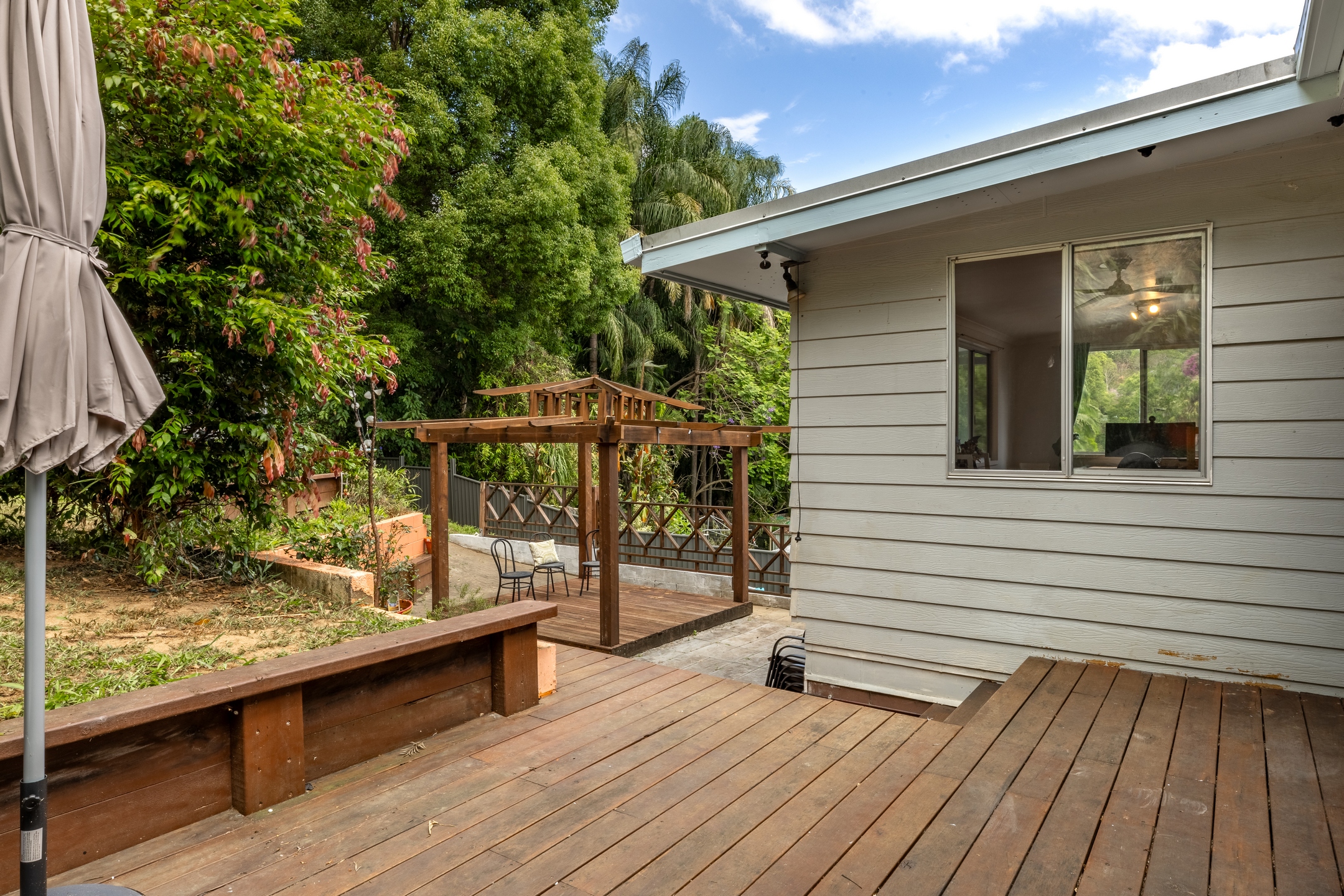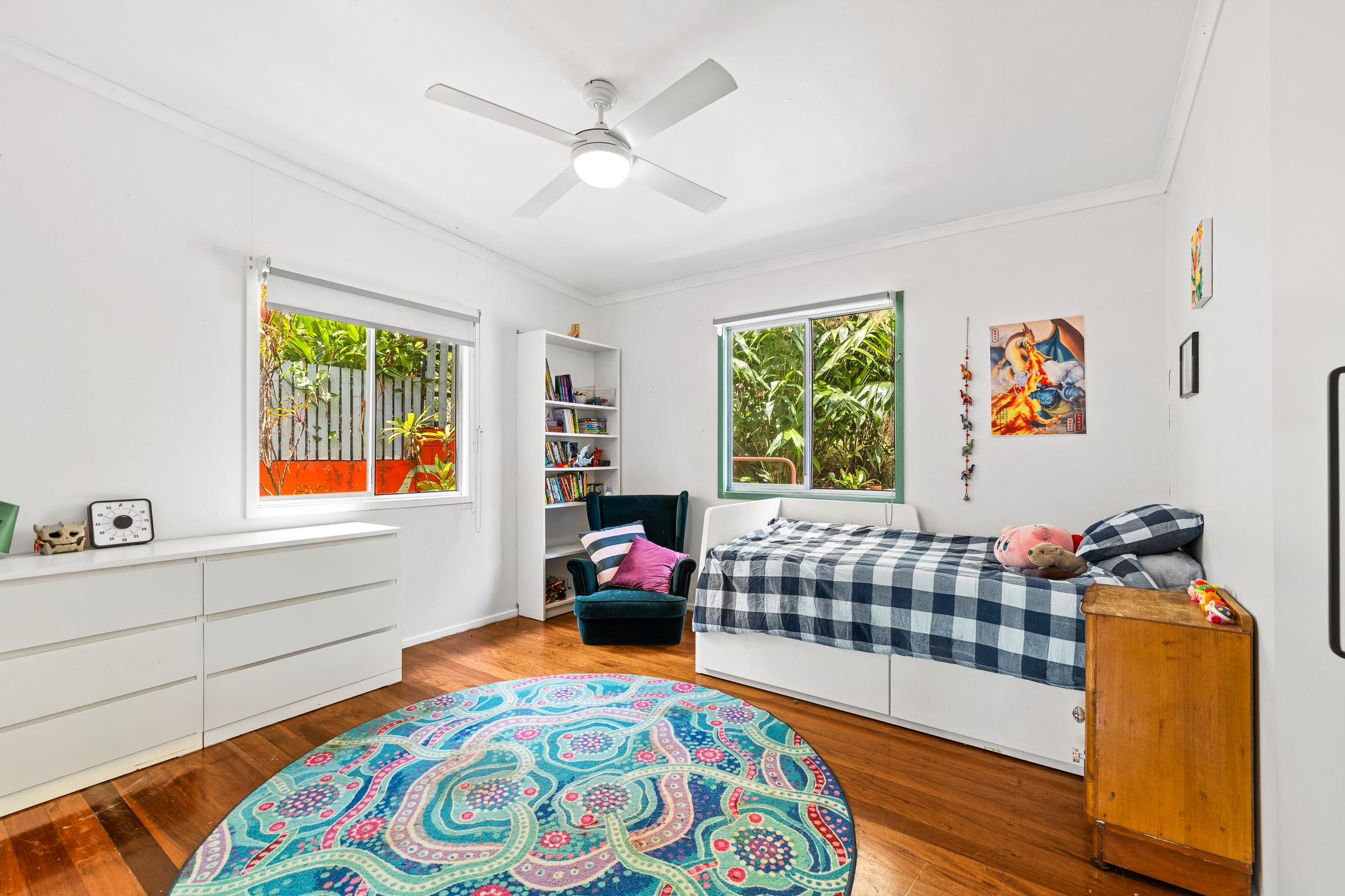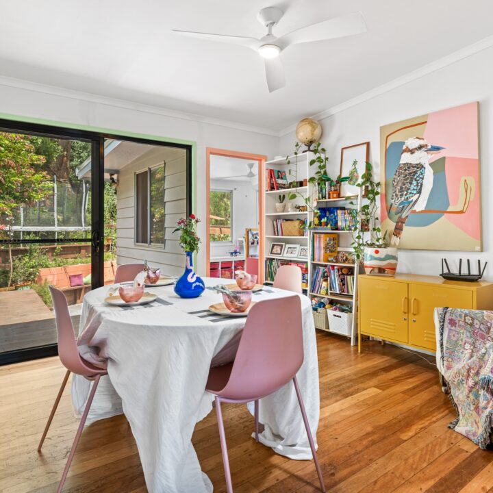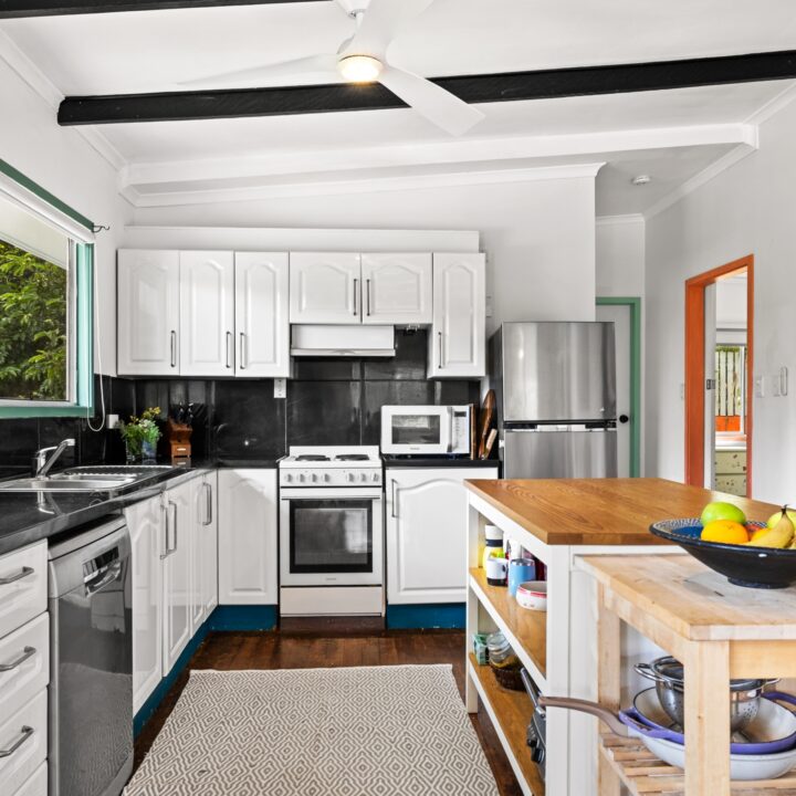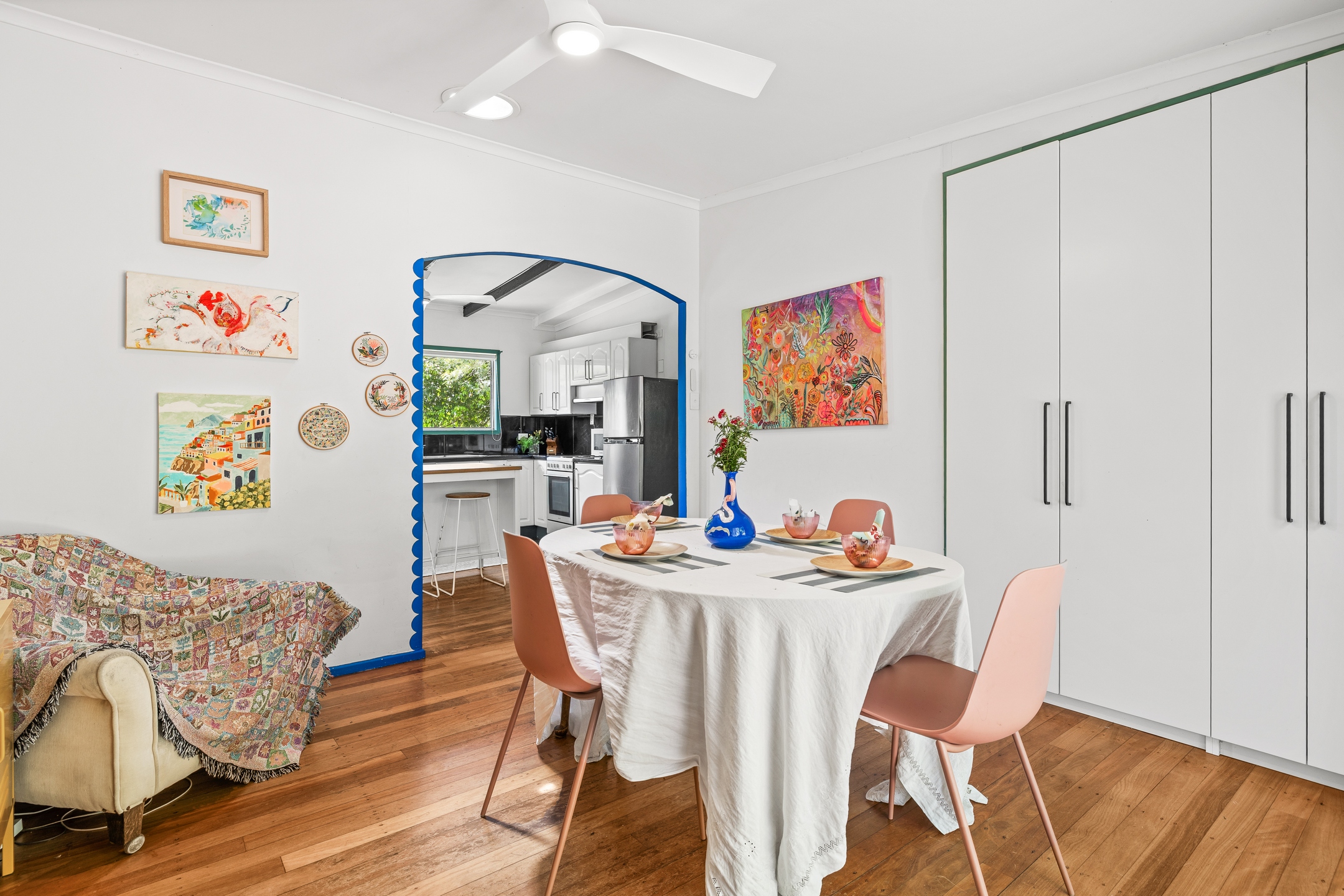 The layout is practical and comfortable, featuring three generous bedrooms, one bathroom, and an open-plan kitchen, dining, and living area that flows to the outdoors. Timber floorboards, high ceilings, cooling breezes, and natural light help keep the home feeling warm and welcoming. There is also a built-in office or work-from-home space under the house, creating flexibility for modern living.