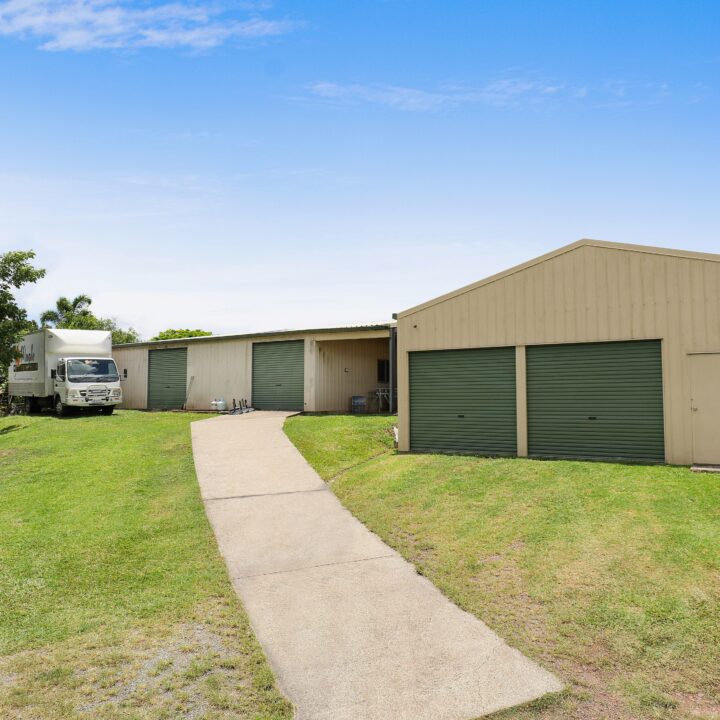 – 80m² high-clearance shed with remote doors and 10- & 15-amp power