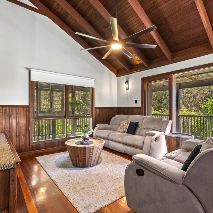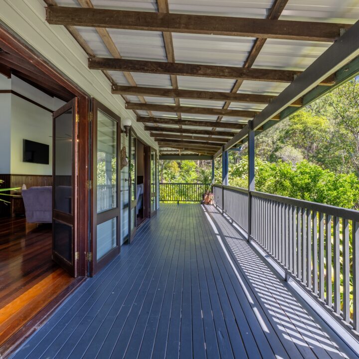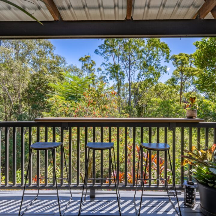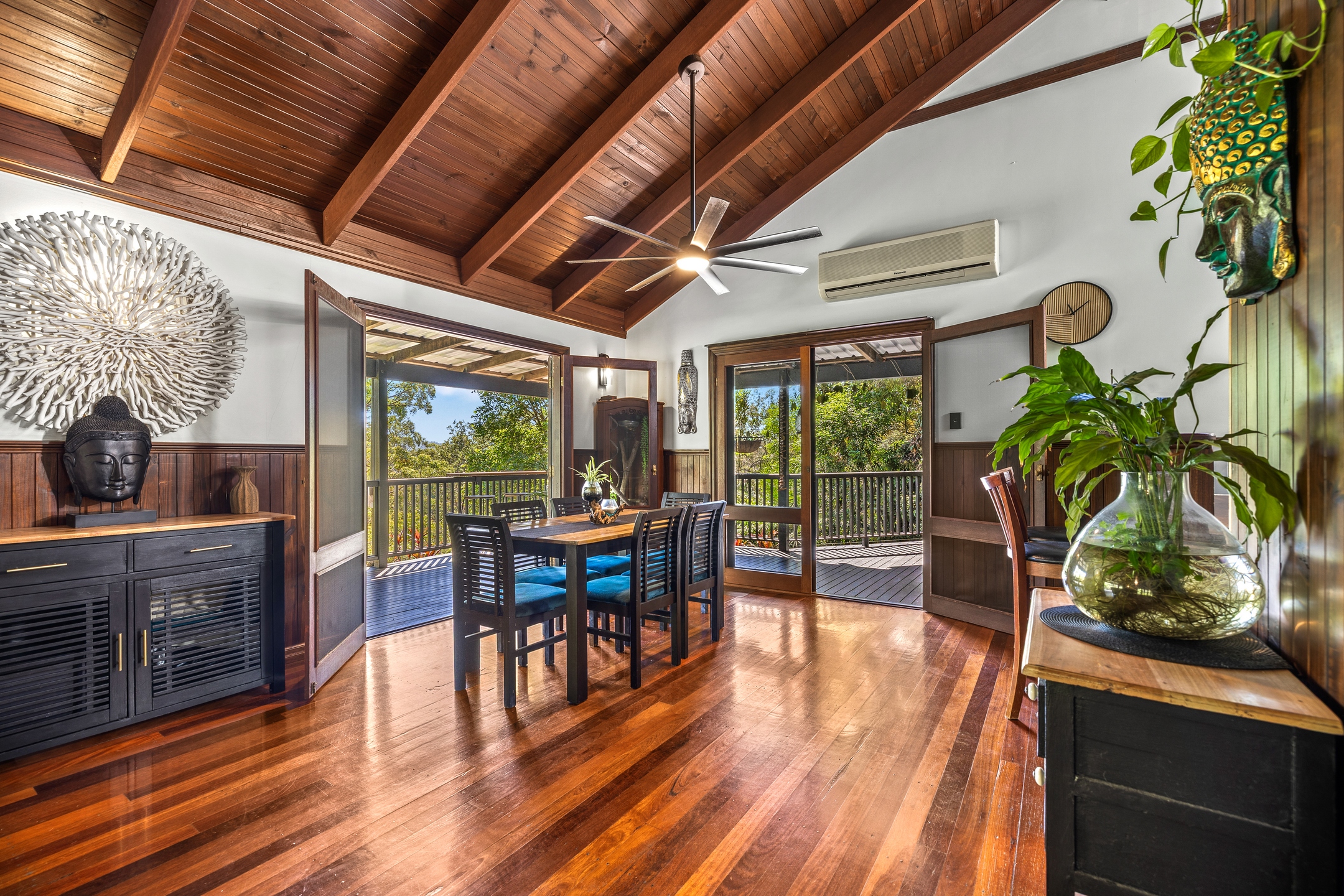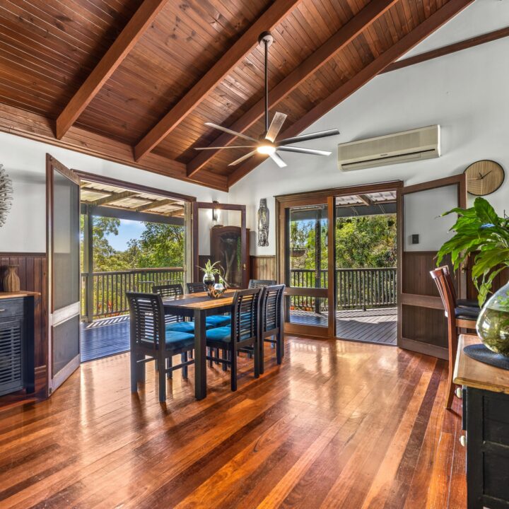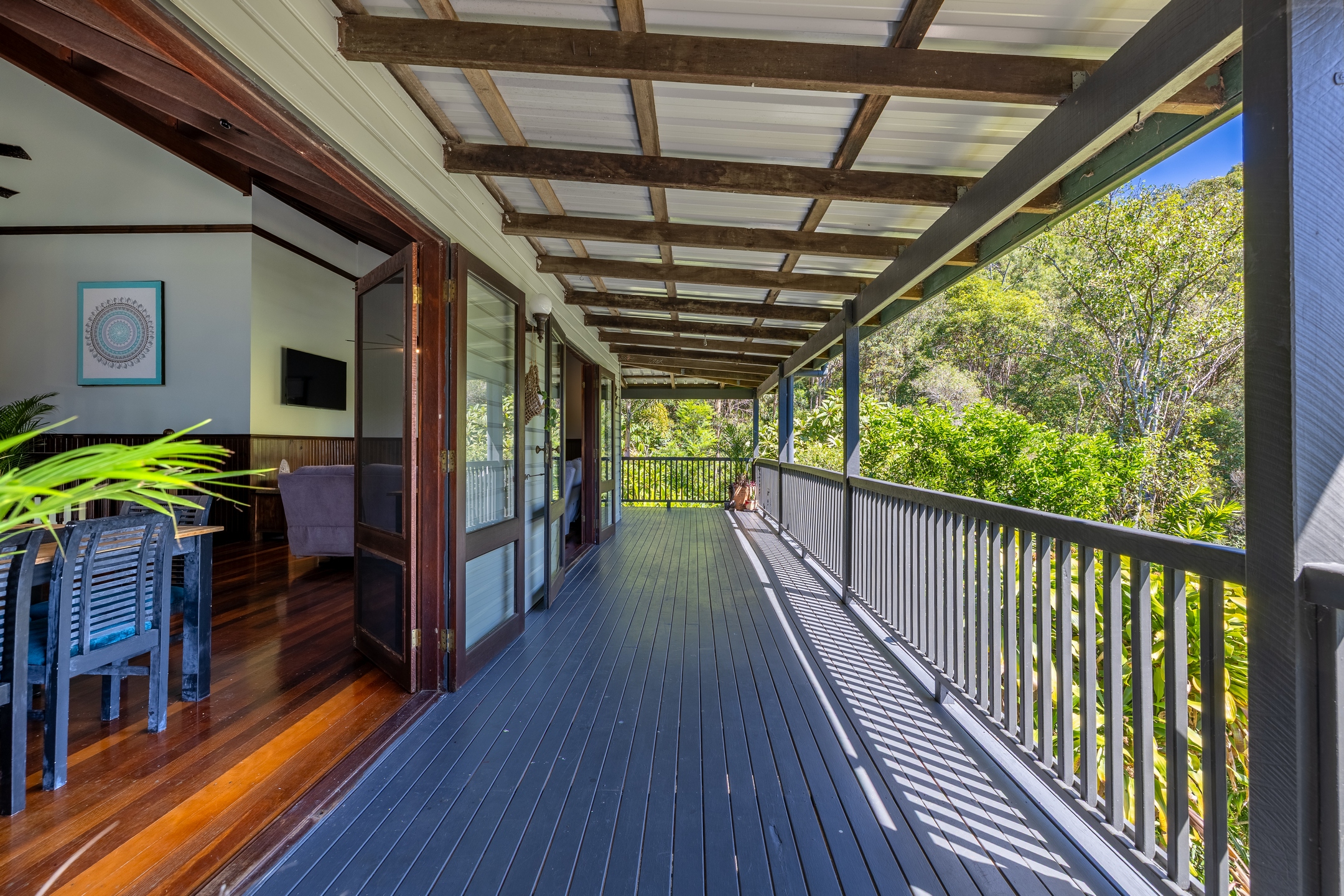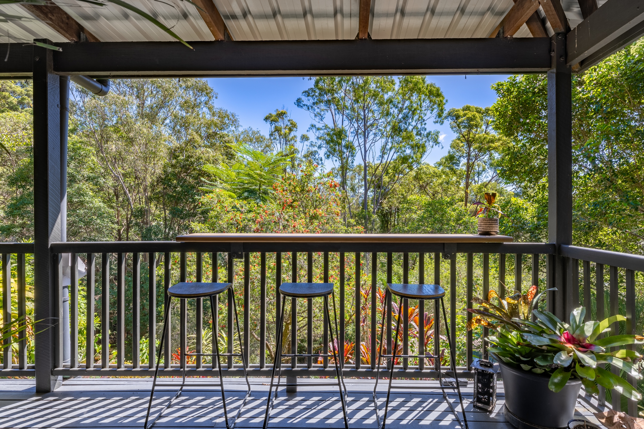Set on 8,330m² of north-facing land, surrounded by lush greenery and birdlife, this is the kind of property that immediately slows you down. The home itself sits elevated, with expansive wrap-around decks, set amongst the canopies and designed to capture the breeze, the outlook, and the stillness that makes this part of the hinterland so special.