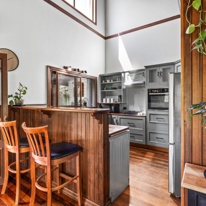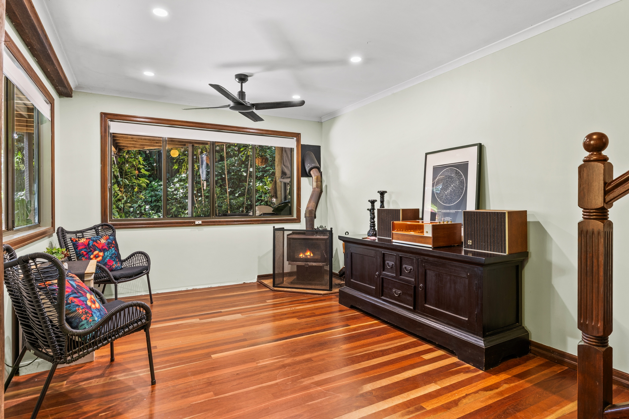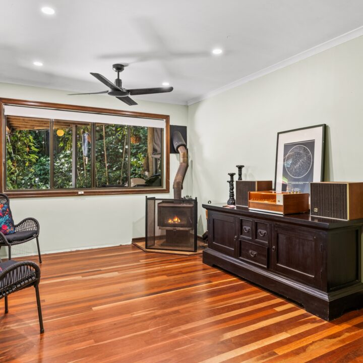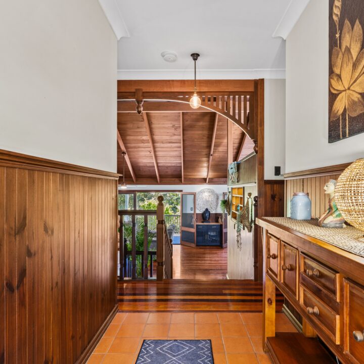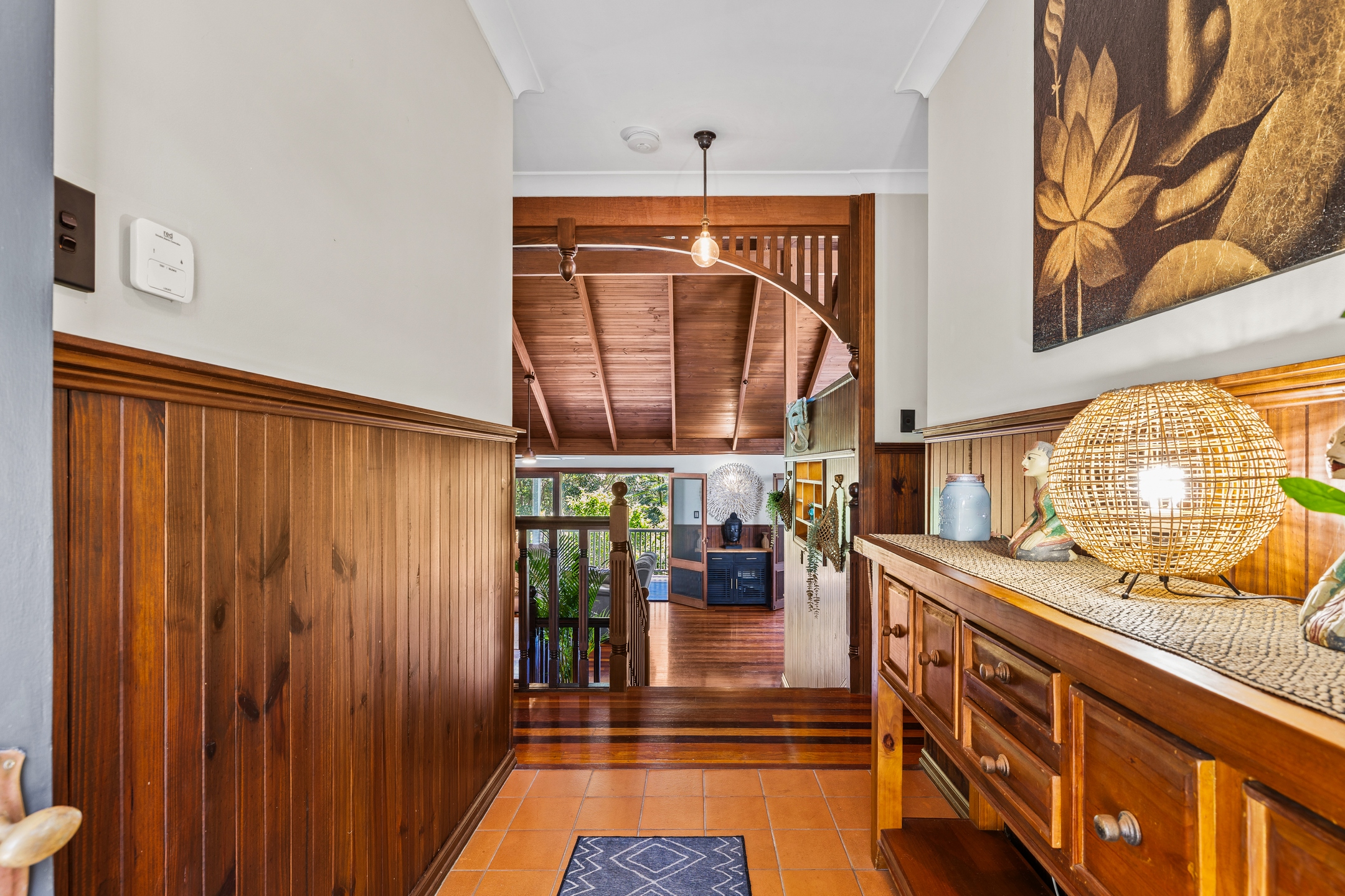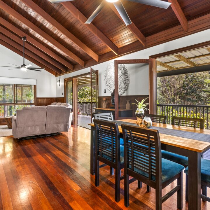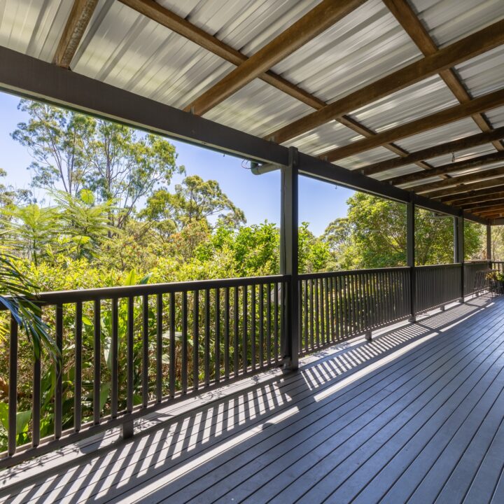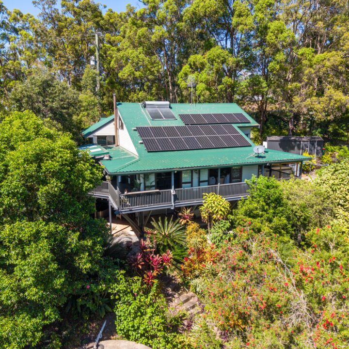 Set on 8,330m² of north-facing land, surrounded by lush greenery and birdlife, this is the kind of property that immediately slows you down. The home itself sits elevated, with expansive wrap-around decks, set amongst the canopies and designed to capture the breeze, the outlook, and the stillness that makes this part of the hinterland so special.