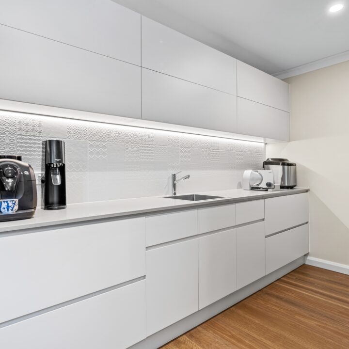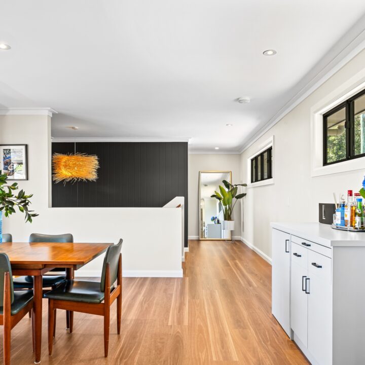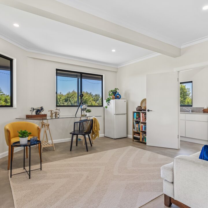 The light-filled layout includes three generous bedrooms, two stylish bathrooms, and three separate living zones, offering superb flexibility for visiting family, guests, or dual-living configurations. The custom-designed kitchen with its butler’s pantry, Miele appliances, induction cooktop, and stone finishes elevates both entertaining and day-to-day simplicity.