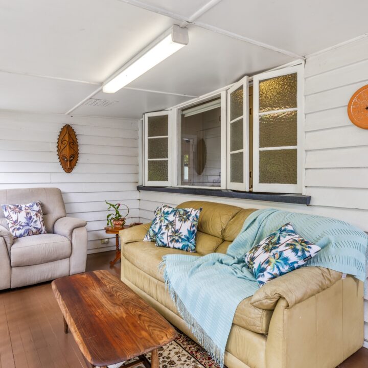 Inside, the home is spacious and flexible. An entry foyer leads to the original timber kitchen with gas cooktop, two large internal bedrooms (master with air-conditioning), and a separate living area also air-conditioned for year-round comfort. The wraparound sleepout adds incredible versatility, offering space for additional bedrooms, a study, dining area, sitting room or second living zone – whatever suits your lifestyle.
